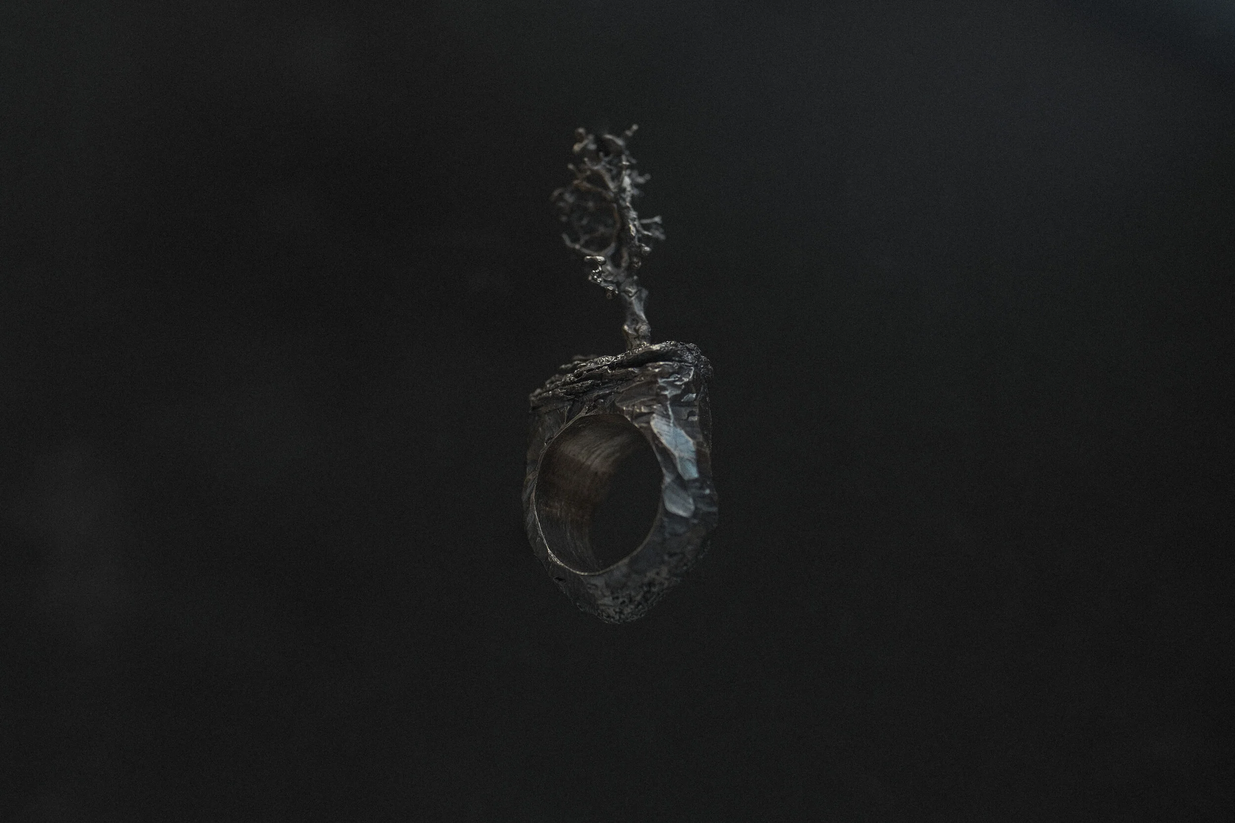 Unique organic rings, lost cast from selected decayed wood barks and organic material with naturally occurring lichen details, for raw and ethereal natural beauty. Sculpted from silver or brass, in tailored sizes. Each piece’s individual characteristics are at the artist discretion, in collaboration with the client. Includes artist consultation.